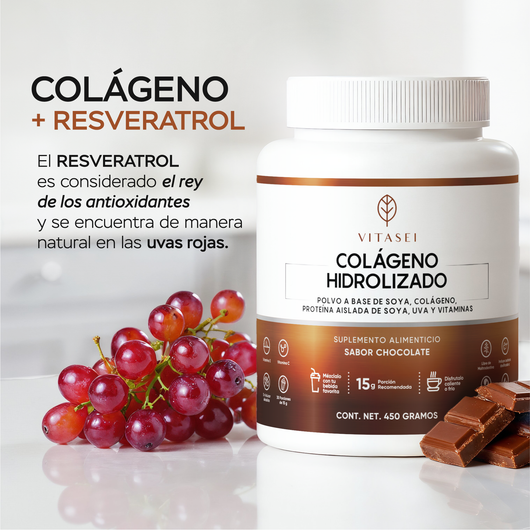 Colágeno Hidrolizado con Resveratrol, Biotina y Vitamina C con sabor chocolate - Fórmula con base de soya sin edulcorantes