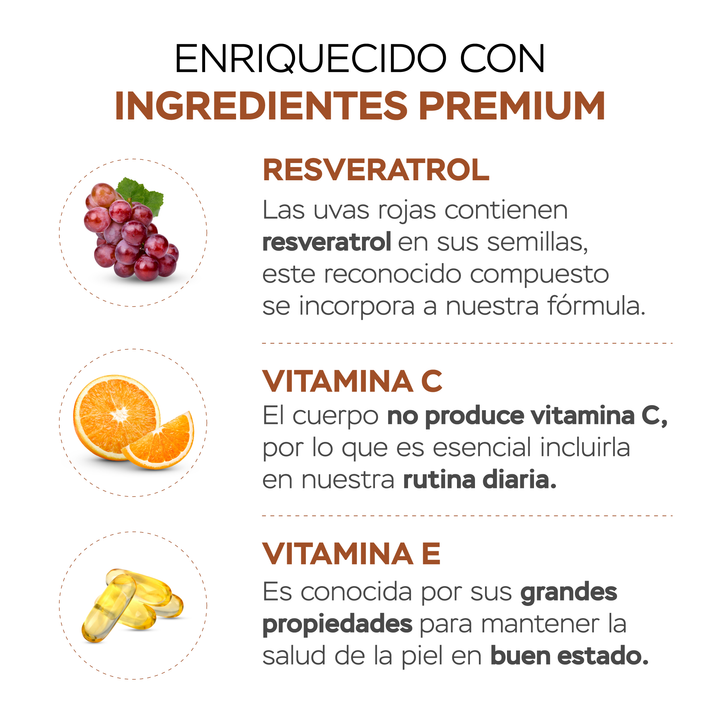 Además de colágeno hidrolizado, nuestra fórmula está enriquecida con Resveratrol, un conocido antioxidante. Además, esta fórmula contiene Vitamina E, Vitamina C y Vitamina A.