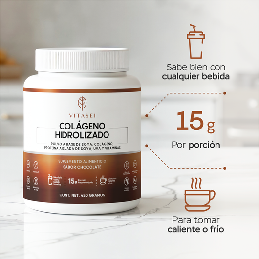 - El colágeno de chocolate es ideal para acompañarlo como tu bebida favorita o recetas.
