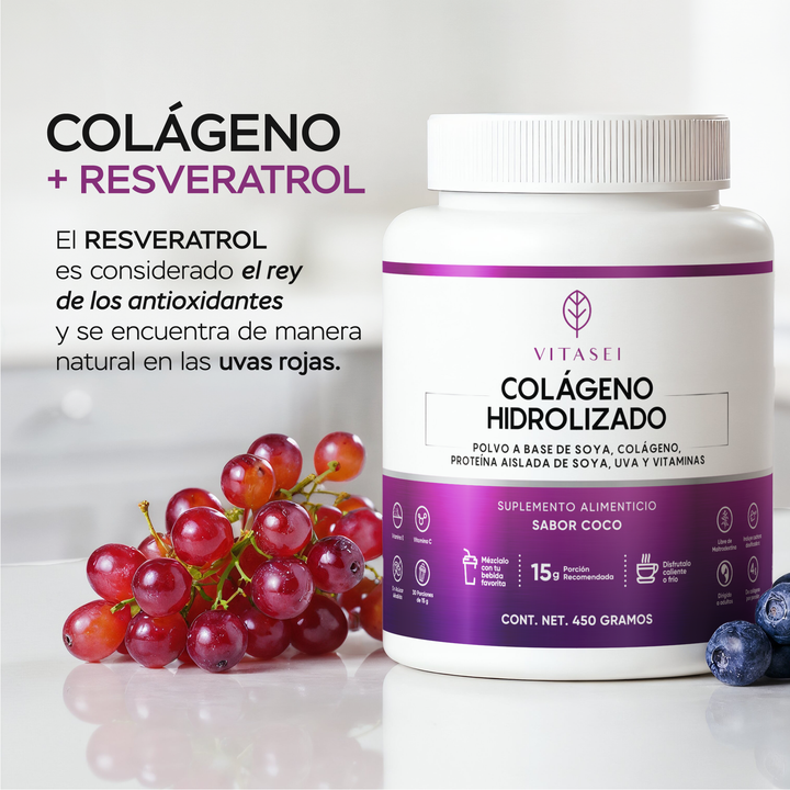 Además de colágeno hidrolizado, nuestra fórmula está enriquecida con Resveratrol, un conocido antioxidante. Además, esta fórmula contiene Vitamina E, Vitamina C y Vitamina A.