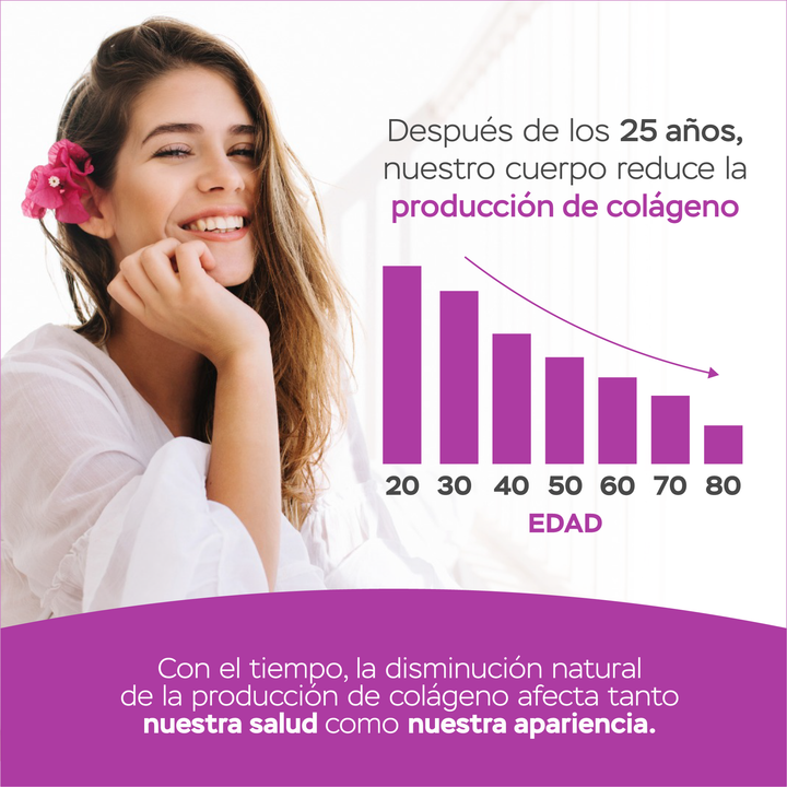 La piel se ve muy afectada con la pérdida de colágeno, debido a que este actúa como un "Pegamento" que la mantiene firme. El colágeno que produce nuestro cuerpo, nos ayuda a prevenir: