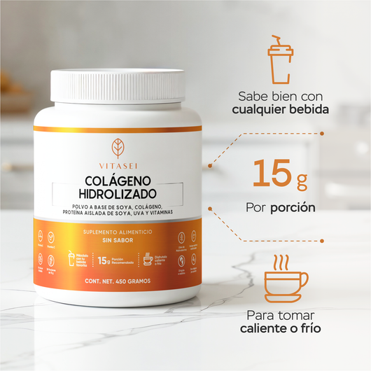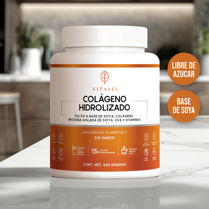 Colágeno Hidrolizado a base de soya enriquecido con Resveratrol, Vitamina C, Biotina, Vitamina A, Vitamina D, Vitamina B1, B6 Y B12.