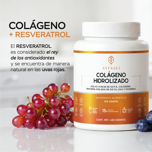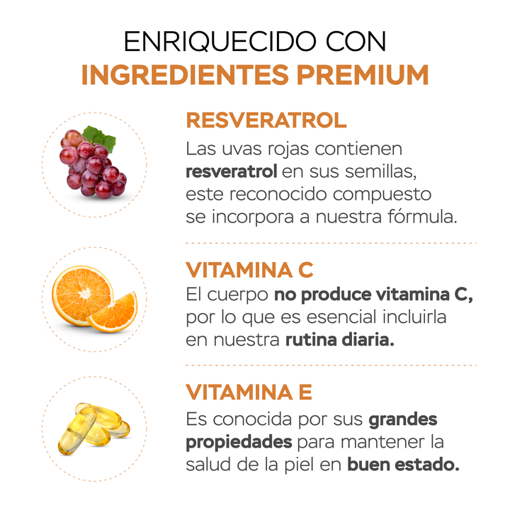 Además de colágeno hidrolizado, nuestra fórmula está enriquecida con Resveratrol, un conocido antioxidante. Además, esta fórmula contiene Vitamina E, Vitamina C y Vitamina A.