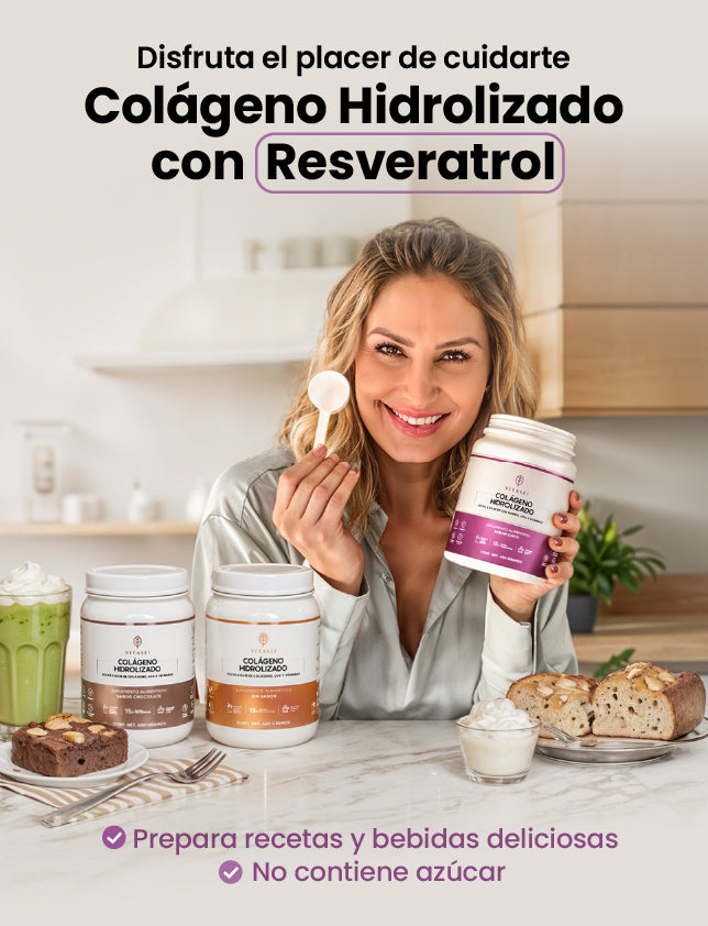 Nuestra fórmula de colágeno está enriquecida con Resveratrol, Vitamina E y Vitamina C, ingredientes clave para tu belleza y bienestar.