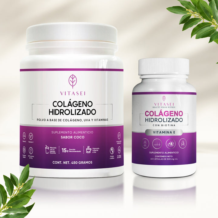 Este kit también contiene colágeno en cápsulas con Resveratrol (Extracto de Uva) y Extracto de Arándanos Azules y está enriquecido con Vitamina C, Vitamina D3 y Vitamina E.