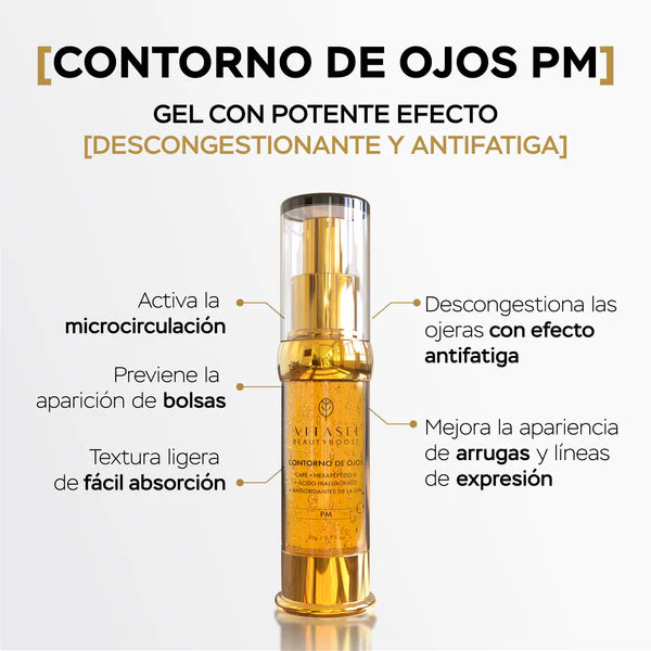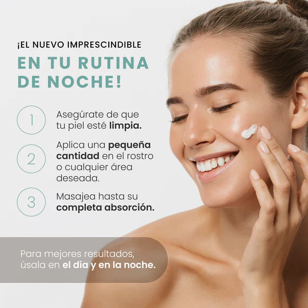 Contorno noche: Aplica una pequeña cantidad alrededor del contorno de los ojos antes de dormir, dando suaves toquecitos con la yema de los dedos para facilitar la absorción.