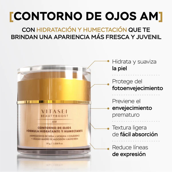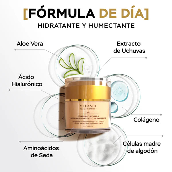 La fórmula de día contiene células madre de algodón, ácido hialurónico y aminoácidos de seda que ayudan a hidratar profundamente y proteger la piel del foto envejecimiento, mientras que la fórmula de noche contiene cafeína, ACETIL HEXAPÉPTIDO-8, extracto de uva y extracto de pepino que ayudan a atenuar las arrugas finas, bolsas y líneas de expresión. Descongestiona las ojeras con su efecto anti fatiga y protege la piel del contorno de los ojos del envejecimiento prematuro.